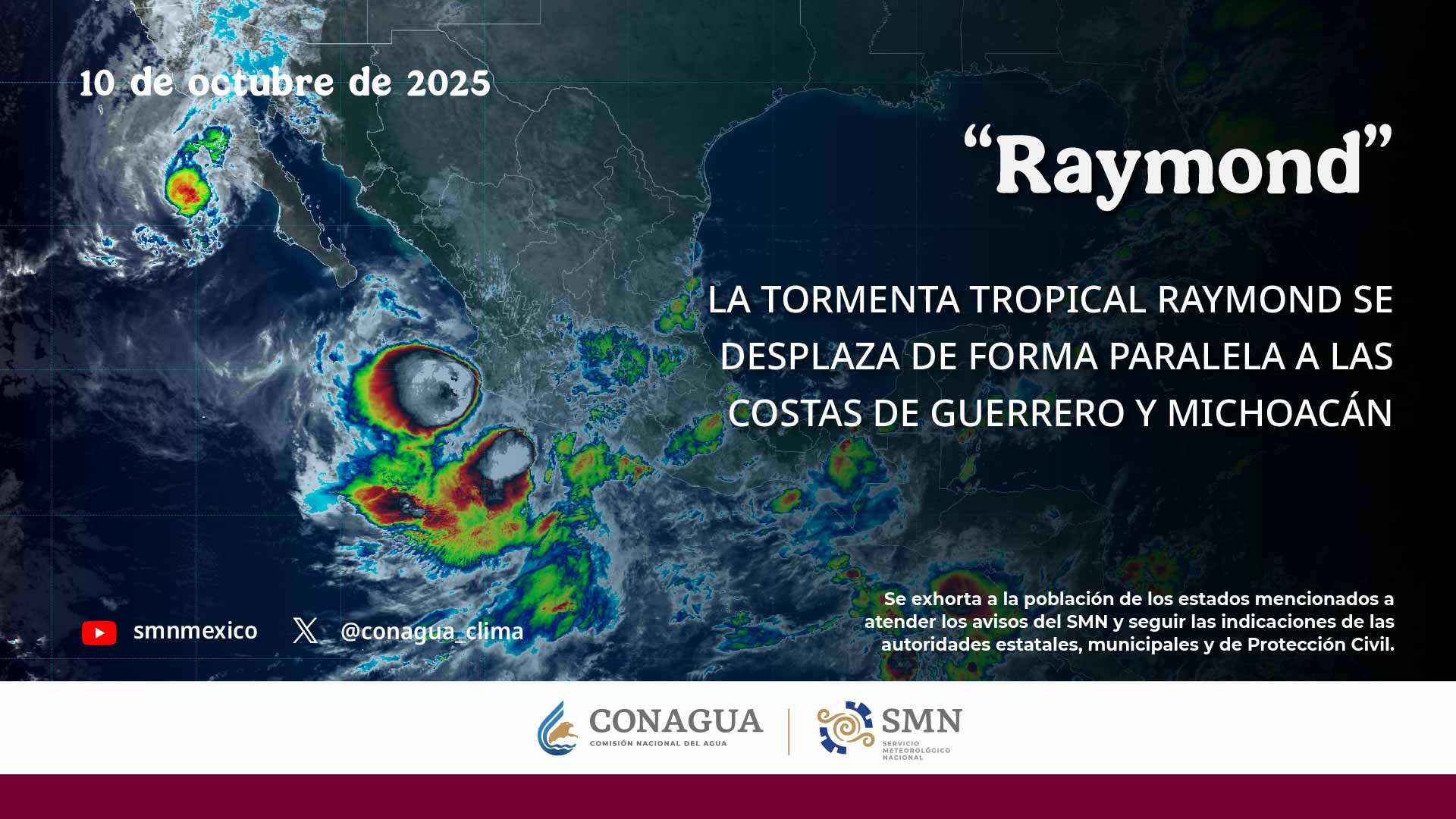 CDMX, 10 de octubre del 2025.- Este día viernes, la tormenta tropical Raymond se desplazará de forma paralela a las costas de Guerrero y Michoacán, generando lluvias puntuales intensas en Jalisco, Colima, Michoacán y Guerrero (suroeste), así como lluvias muy fuertes en Nayarit.