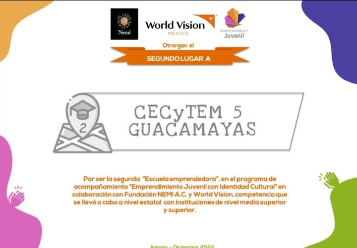 Morelia, Michoacán, 27 de diciembre del 2022.- Estudiantes del Colegio de Estudios Científicos y Tecnológicos del Estado de Michoacán (Cecytem) lograron un segundo y un tercer lugar, así como un reconocimiento en la Feria de Proyectos del Programa Emprendimiento Juvenil NEMI, A. C y World Vision, esto como parte del Programa de Emprendimiento Juvenil con Identidad Cultural.