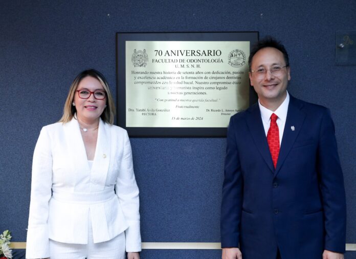Morelia, Michoacán, a 18 de marzo de 2024.- Con el compromiso de continuar siendo una institución innovadora y de vanguardia, la Facultad de Odontología de la Universidad Michoacana de San Nicolás de Hidalgo (UMSNH) conmemoró su 70 aniversario, actividad a la que asistió la rectora Yarabí Ávila González.