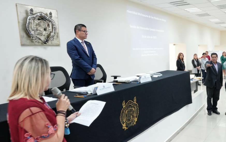 Morelia, Mich; a 14 de julio del 2023.- Para formalizar la representación de Ex Alumnos Nicolaitas en el Consejo Universitario, la rectora Yarabí Avila González tomó la protesta a Rodolfo Lucio Domínguez como consejero universitario de la dicha agrupación de profesionsitas.