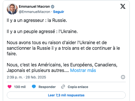 “Creo que todos hemos tenido razón al ayudar a Ucrania y sancionar a Rusia hace tres años y al continuar haciéndolo. Y cuando digo nosotros, son Estados Unidos, los europeos, los canadienses, los japonenes y algunos más”, ha insistido el presidente francés. “Si hay alguien que juega a la Tercer Guerra Mundial se llama Vladímir Putin”, ha rematado.