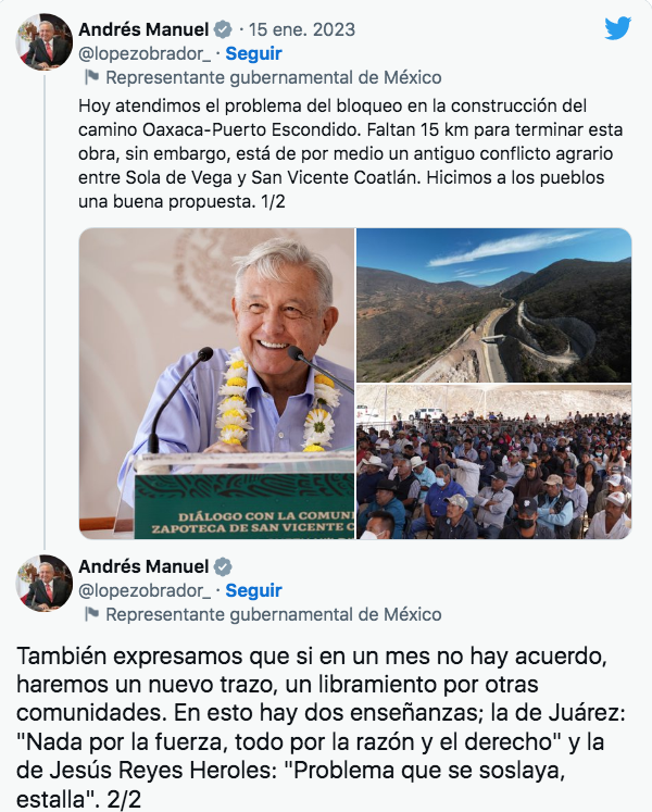 Oaxaca, 15 de enero del 2023.- El presidente Andrés Manuel López Obrador concluyó la gira de trabajo del fin de semana dialogando con integrantes de la comunidad zapoteca de San Vicente Coatlán en Oaxaca para solucionar el bloqueo en la construcción del camino Oaxaca-Puerto Escondido.