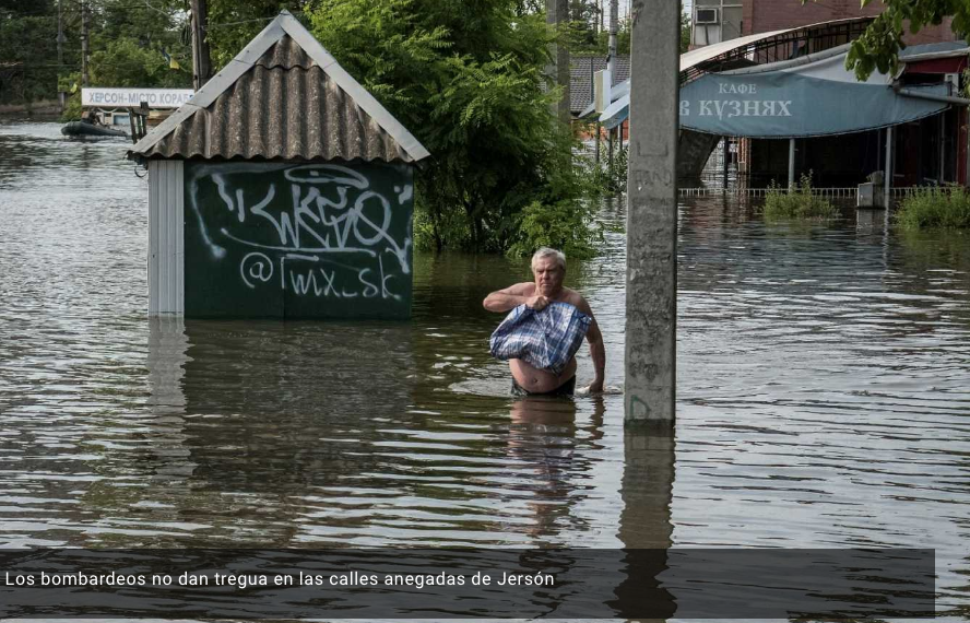 08 de junio del 2023.- El agua ha inundado ya 600 kilómetros cuadrados en la ciudad de Jersón después de la destrucción de la presa de Nova Kajovka. La agencia TASS habla ya de 14.000 casas anegadas. Las tareas de rescate y evacuación van casa por casa, tejado por tejado. Los drones han servido para suministrar agua a los vecinos atrapados que no pueden salir de sus casas mientras siguen los combates.