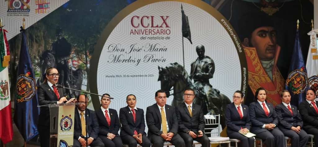 Morelia, Michoacán, a 30 de septiembre de 2025.- “La justicia era la base de la convivencia para don José Maria Morelos y Pavón, él afirmaba que las leyes debían servir al bien común y no a los intereses de unos cuantos, practicar la justicia en nuestra vida cotidiana significa ser honestos, respetar a los demás y defender lo que es correcto, incluso cuando resulta difícil, quizá uno de sus legados más profundos”, afirmó la rectora de la Universidad Michoacana de San Nicolás de Hidalgo (UMSNH), Yarabí Ávila González, durante el acto con motivo del CCLX Aniversario del natalicio de don José María Morelos y Pavón, celebrado en la preparatoria nicolaita que lleva su nombre.
