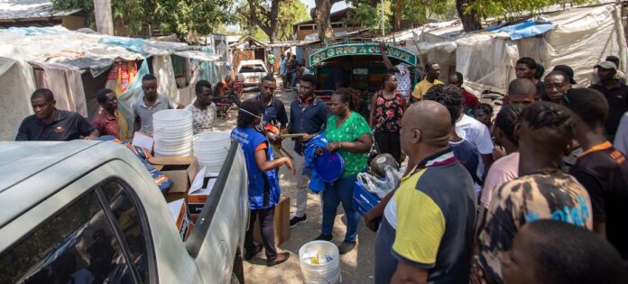© OPS/David Lorens Mentor La ayuda de la OPS a las poblaciones vulnerables en Puerto Príncipe se reanudó esta semana con la distribución de material de higiene y saneamiento en los 23 emplazamientos que apoyan.