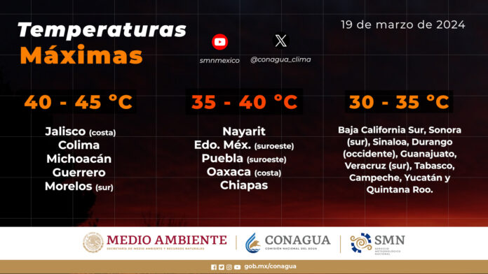 Temperaturas máximas de 40 a 45 °C: Jalisco (costa), Colima, Michoacán, Guerrero y Morelos (sur).