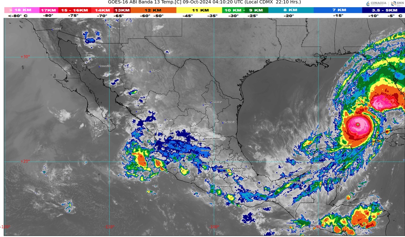posible formación de trombas marinas en las costas de Yucatán, con rachas de 70 a 90 km/h, oleaje de 2 a 4 metros de altura y posible formación de trombas marinas en costas del norte de Campeche y Quintana Roo. Además, se prevén rachas de 60 a 80 km/h y oleaje de 1 a 3 metros de altura en costas del sur de Veracruz y Tabasco, y con rachas de 40 a 60 km/h en el istmo y golfo de Tehuantepec (Oaxaca y Chiapas). Se pronostica que dichas condiciones disminuyan conforme Milton se aleje de costas nacionales. Por otro lado, una zona de baja presión con probabilidad de desarrollo ciclónico que se desplaza lentamente frente a las costas de Jalisco y Nayarit, en interacción con la vaguada monzónica que está próxima a las costas del Pacífico mexicano, ocasionan lluvias puntuales muy fuertes en Nayarit, Jalisco, Colima, Michoacán, Guerrero y Oaxaca; así como viento con rachas de 50 a 70 km/h, oleaje de 1 a 3 metros de altura y posible formación de trombas marinas en las costas de Nayarit y Jalisco. Asimismo, el ingreso de humedad del océano Pacífico y Golfo de México junto con canales de baja presión en el interior del país, originan lluvias puntuales fuertes en Sinaloa, Durango, Zacatecas, Estado de México, Ciudad de México, Morelos, Puebla, Veracruz, Tabasco y Chiapas; chubascos en Aguascalientes, Guanajuato y Tlaxcala, así como lluvias aisladas en Baja California Sur, Sonora, Chihuahua, Nuevo León, Tamaulipas, San Luis Potosí, Querétaro e Hidalgo.