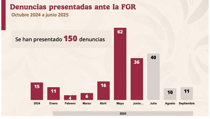 Además, el funcionario detalló que en 2024 se presentaron 15 denuncias, y durante los meses que han transcurrido en 2025 se han interpuesto 135, siendo mayo el mes con más acusaciones ante la FGR.