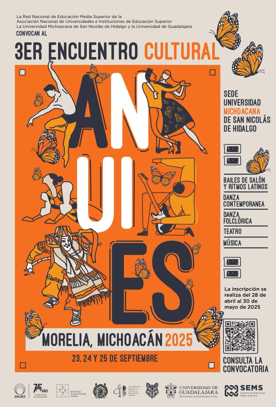 La etapa de pre-registro cierra el próximo 10 de abril, las inscripciones se podrán realizar del 28 de abril al 30 de mayo mediante el envío de un correo a encuentroculturalanuies@sems.udg.mx; las bases de participación se podrán consultar en el sitio https://www.sems.udg.mx/sites/default/files/eventos/convocatoria-3er-encuentro-cultural-anuies-2025.pdf