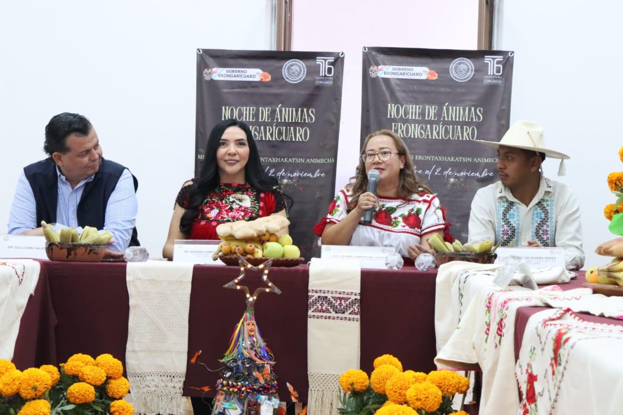 En rueda de prensa, la legisladora coordinadora del Grupo Parlamentario del PRI, acompañada de su homologo, Guillermo Valencia Reyes, quien invitó a la ciudadanía a vivir la experiencia en esta nueva alternativa; así como, de la presidenta municipal de Erongarícuaro, Liliana Campos de la Luz; Luis Rivera, Director de turismo y Cultura; Eduardo Cabrera, titular de Seguridad Pública Municipal; Ericka Lara, directora de Protección Civil, todos de dicho municipio, dieron a conocer el programa de actividades que se llevarán a cabo en el evento denominado “Con el corazón esperamos a las ánimas”.
