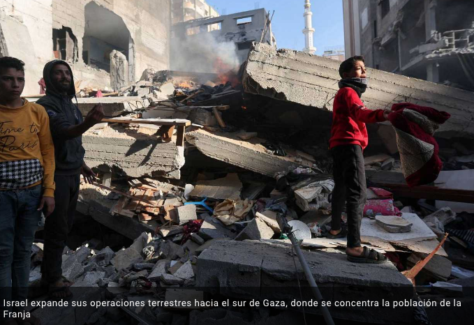 04 de diciembre del 2023.- Israel ha iniciado su ofensiva terrestre contra el sur de la Franja de Gaza, donde se concentra ahora mismo la mayor parte de la población de 2,2 millones del enclave. Tras los bombardeos del fin de semana, que han causado decenas de muertos en Jan Yunis y Ráfah, ahora el Ejército israelí se acerca a la primera ciudad, y asegura que sus tropas están combatiendo sobre el terreno a los milicianos de la organización palestina. Testigos afirman que los tanques están ya a menos de seis kilómetros de Jan Yunis.