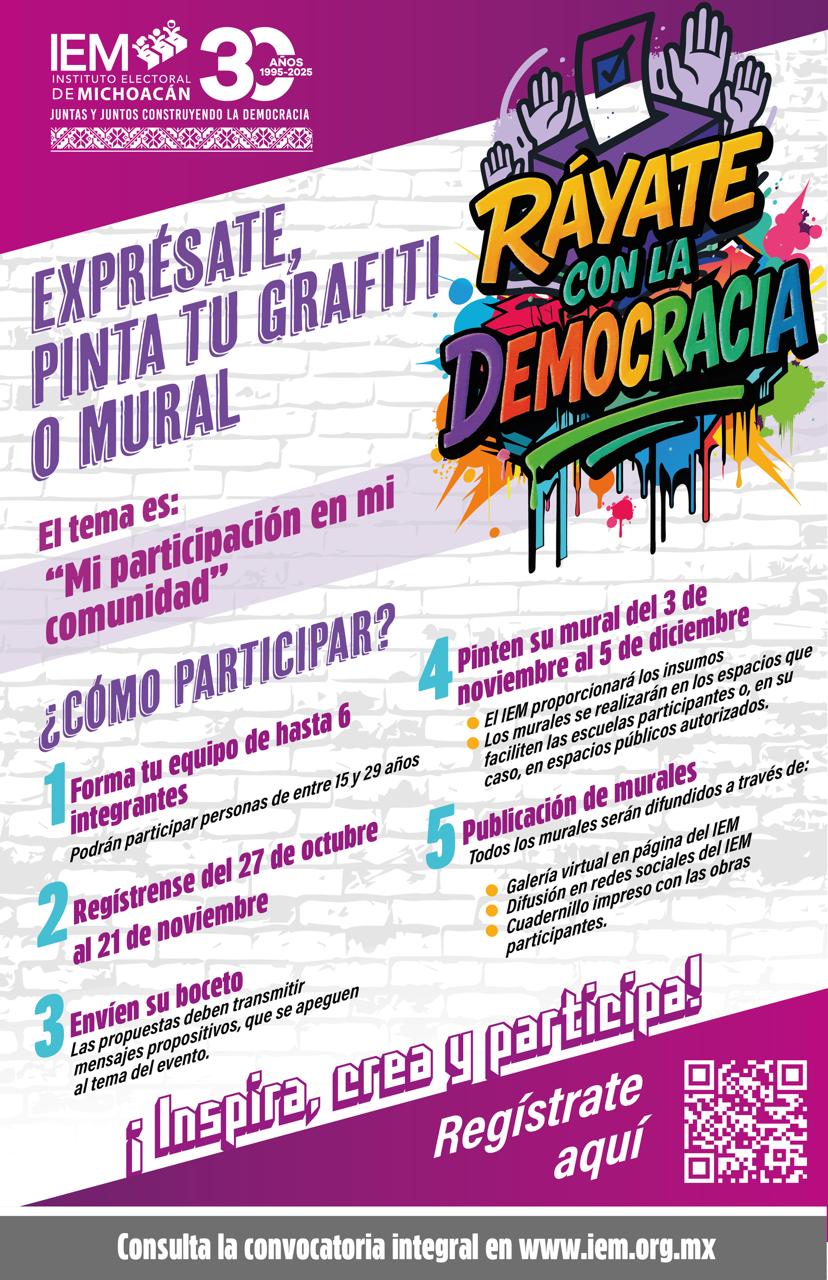 Morelia, Michoacán, 05 de noviembre de 2025. Con el objetivo de fomentar la participación ciudadana y fortalecer la expresión creativa de las juventudes, el Instituto Electoral de Michoacán (IEM) lanzó la convocatoria “Ráyate con la Democracia”, una iniciativa que invita a jóvenes de entre 15 y 29 años a plasmar, a través del arte urbano, su visión sobre la participación en la vida democrática de sus comunidades.