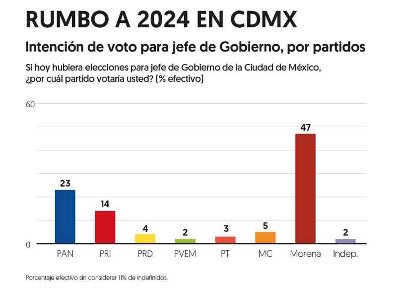 De acuerdo con el sondeo, 47 por ciento de las personas entrevistadas manifestó su preferencia por Morena rumbo a las elecciones para jefe de Gobierno en 2024, porcentaje que aumenta a 52 por ciento si se suman los cinco puntos de apoyo que captan sus aliados, PT y PVEM.