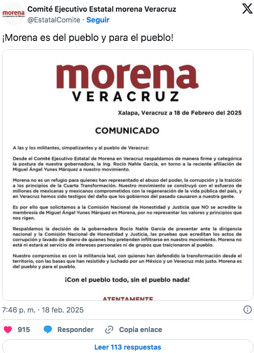 Incluso, el Comité Ejecutivo estatal Morena Veracruz respaldó la postura de la mandataria al asegurar que el partido “no es refugio para quienes han representado el abuso del poder, la corrupción y la tradición a los principios de la cuarta transformación”.