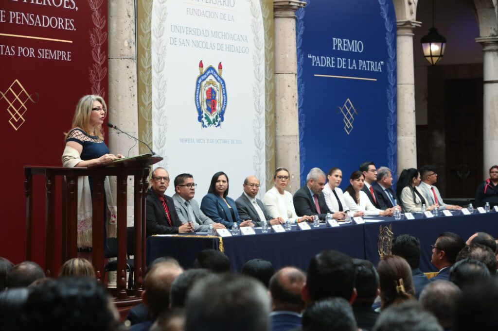 Sostuvo que el 15 de octubre se conmemora la fundación de la UMSNH, la primera institución con autonomía universitaria en el país y en América Latina, al tiempo que se dijo honrada de trabajar en un espacio donde se venera la razón y los hechos, donde se acerca la verdad, tras recordar las palabras de su padre: “El sujeto que dice la verdad incomoda pero trasciende, quién incumple tarde o temprano sucumbe”.