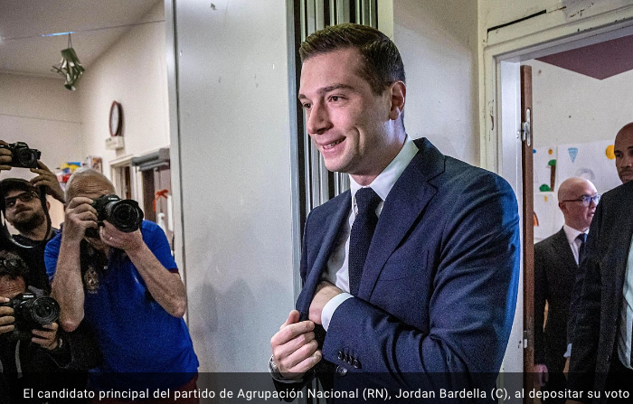 30 de junio del 2024.- El partido ultraderechista francés Agrupación Nacional (RN por sus siglas en francés) lidera la primera vuelta de las elecciones legislativas con cerca del 34% de los votos, según las encuestadoras IFOP, Ipsos, OpinionWay y Elabe. Queda abierta la posibilidad de que su candidato Jordan Bardella logre ser investido primer ministro tras una mayoría absoluta en la segunda vuelta del 7 de julio, ya que solo una de las proyecciones lo ve así.