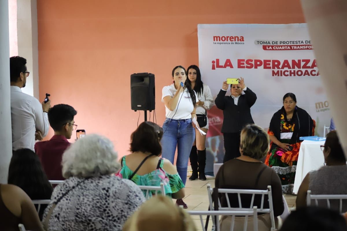 Los Reyes, Michoacán, a 17 de octubre de 2023.- Giulianna Bugarini Torres, consejera nacional de Morena, tomó protesta a líderes de 32 comunidades indígenas del municipio de Los Reyes, como nuevos miembros de los Comités en Defensa de la Cuarta Transformación.