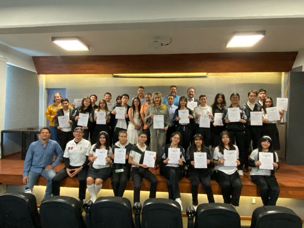 Los alumnos y la preparatoria, a través de la directora Norma Lorena Gaona Farías y el presidente de la Mesa Directiva de la Asociación de Padres de Familia de la PREFECO, Alfredo Paniagua Ledesma, recibieron de manos de Job Reyes, representante de CENEVAL, la constancia de participación en la Prueba PISA 2025, con lo que se reafirmó el destacado papel del plantel en este proceso internacional.
