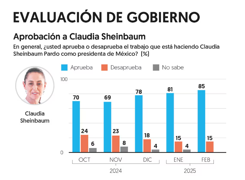 CDMX, 03 de marzo del 2025.- La presidenta Claudia Sheinbaum registró 85 por ciento de aprobación ciudadana en febrero, de acuerdo con la más reciente encuesta nacional de El Financiero.