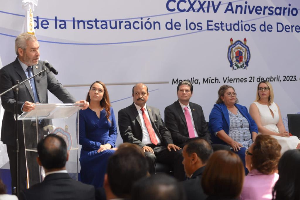Morelia, Michoacán, a 21 de abril de 2023.- “Estoy convencido que la Universidad Michoacana de San Nicolás de Hidalgo jugará un papel determinante en estos tiempos y en mi gobierno”, afirmó el gobernador, Alfredo Ramírez Bedolla, al fungir como orador oficial en el CCXXIV Aniversario de la Instauración de los Estudios de Derecho en Michoacán, evento al que también asistió la rectora, Yarabí Ávila González.