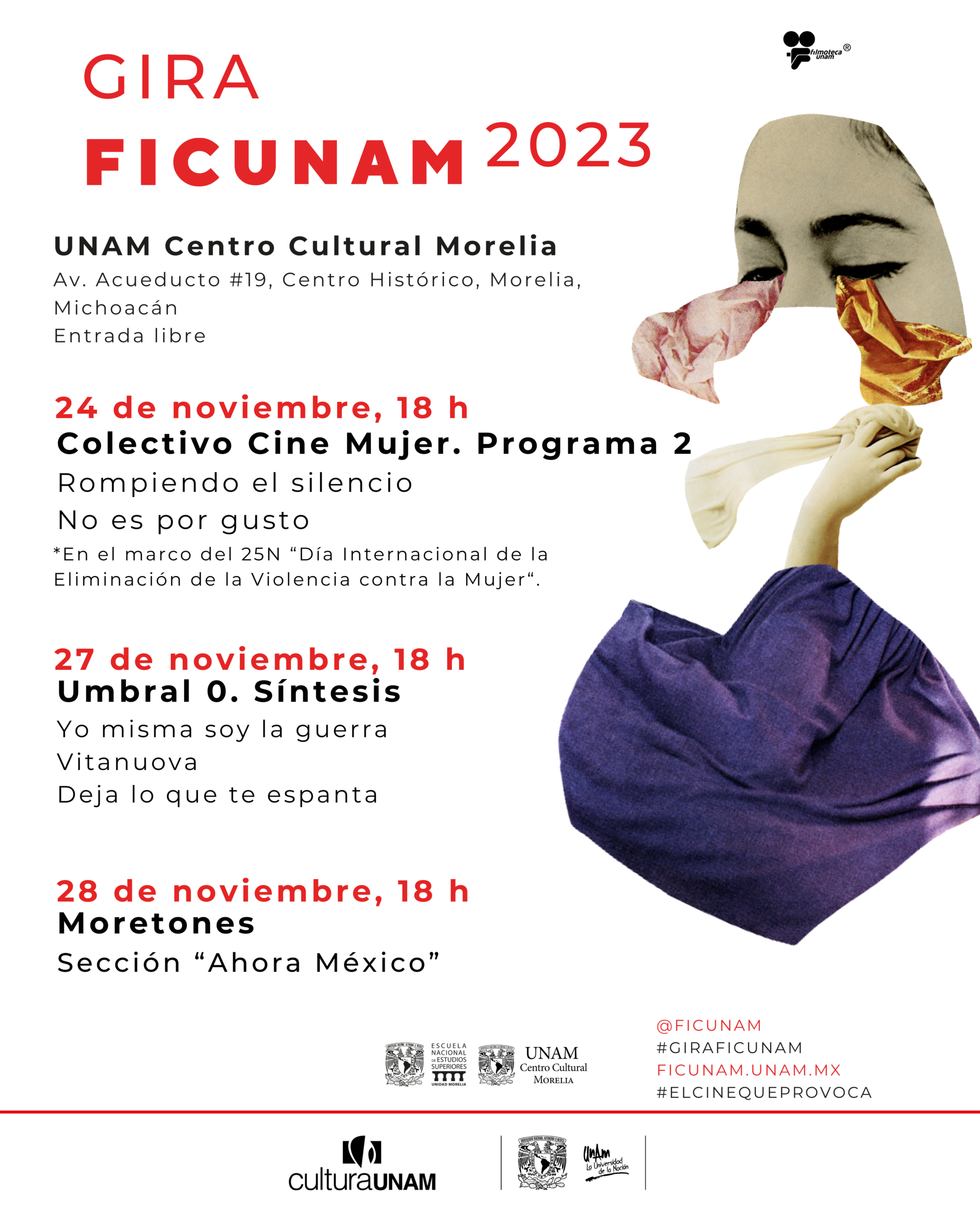 Morelia, Michoacán, 16 de noviembre de 2023.- La UNAM Centro Cultural Morelia, de la Escuela Nacional de Estudios Superiores (ENES Morelia UNAM), será sede por primera vez de la Gira del Festival Internacional de Cine de la UNAM (FICUNAM), los próximos días 24, 27 y 28 de noviembre del 2023 a las 18 horas.