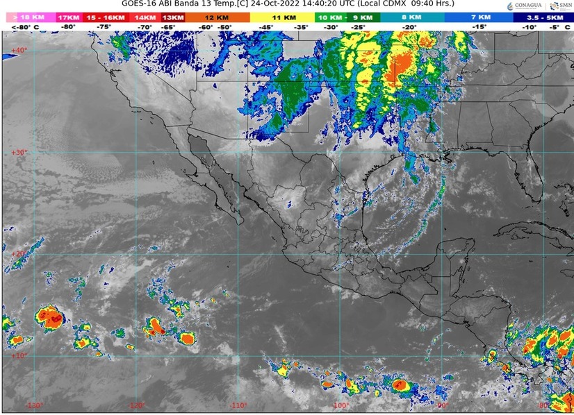 Golfo de México: Cielo medio nublado a nublado en la región con lluvias e intervalos de chubascos en Tamaulipas, lluvias aisladas en Veracruz y sin lluvia en Tabasco. Ambiente matutino fresco a templado, con bancos de niebla al amanecer en zonas altas. Por la tarde, ambiente cálido. Viento del sur y sureste de 15 a 30 km/h en la región, con rachas de 50 a 70 km/h en Tamaulipas.