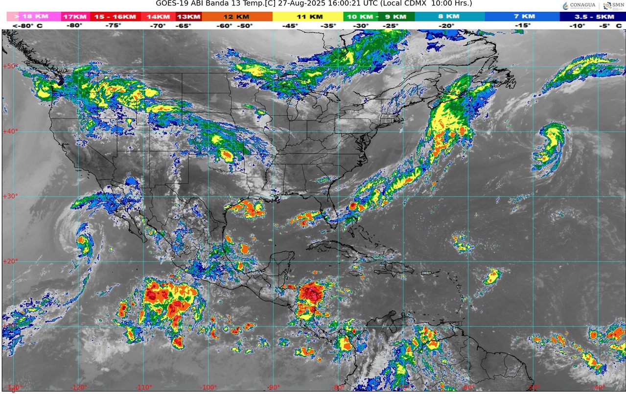 CDMX, 27 de agosto del 2025.- Para hoy miércoles, el monzón mexicano en interacción con una circulación ciclónica en niveles medios de la atmósfera sobre el sur del golfo de California y con inestabilidad atmosférica, generarán lluvias puntuales intensas en Sonora, Chihuahua y Sinaloa; muy fuertes en Durango; lluvias fuertes en Baja California Sur y Nayarit, y chubascos en Baja California.