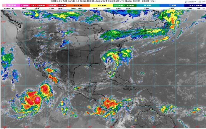 CDMX, 06 de agosto del 2024.- Para hoy martes, la tormenta tropical Fabio se localizará al sur-suroeste de las costas de Baja California Sur. Su circulación reforzará la probabilidad de lluvias puntuales muy fuertes en Nayarit y Jalisco y lluvias con intervalos de chubascos en Baja California Sur, acompañadas con descargas eléctricas, así como viento con rachas de 50 a 70 km/h y oleaje de 2 a 3 metros de altura en Baja California Sur, con posible formación de trombas marinas en costas de Jalisco, así como de 40 a 60 km/h con oleaje de 1 a 2 metros de altura en costas de Nayarit.
