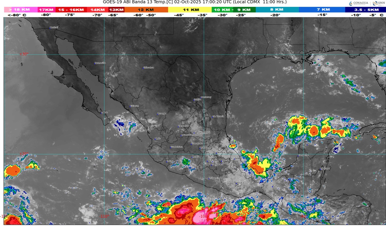 CDMX, 02 de octubre del 2025.- Para hoy jueves, una zona de baja presión con probabilidad para desarrollo ciclónico al sur de Guerrero y la vaguada monzónica que se extenderá frente a las costas del Pacífico Sur Mexicano, ocasionarán lluvias puntuales intensas en Guerrero; muy fuertes en Michoacán, Colima y Nayarit; fuertes en Jalisco, e intervalos de chubascos en Sinaloa.