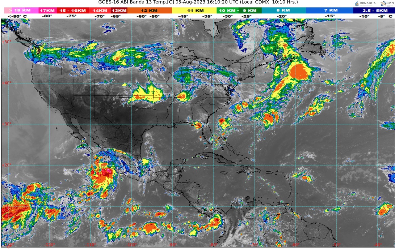 CDMX, 05 de agosto del 2023.- Este día sábado, la onda tropical Núm. 18 se integrará en la circulación de una zona de baja presión con alta probabilidad para desarrollo ciclónico, dando origen a una posible depresión tropical al suroeste de Jalisco, produciendo lluvias puntuales intensas, rachas de viento de 60 a 70 km/h y oleaje de 2 a 4 metros de altura en las costas de Jalisco, Colima y Michoacán.