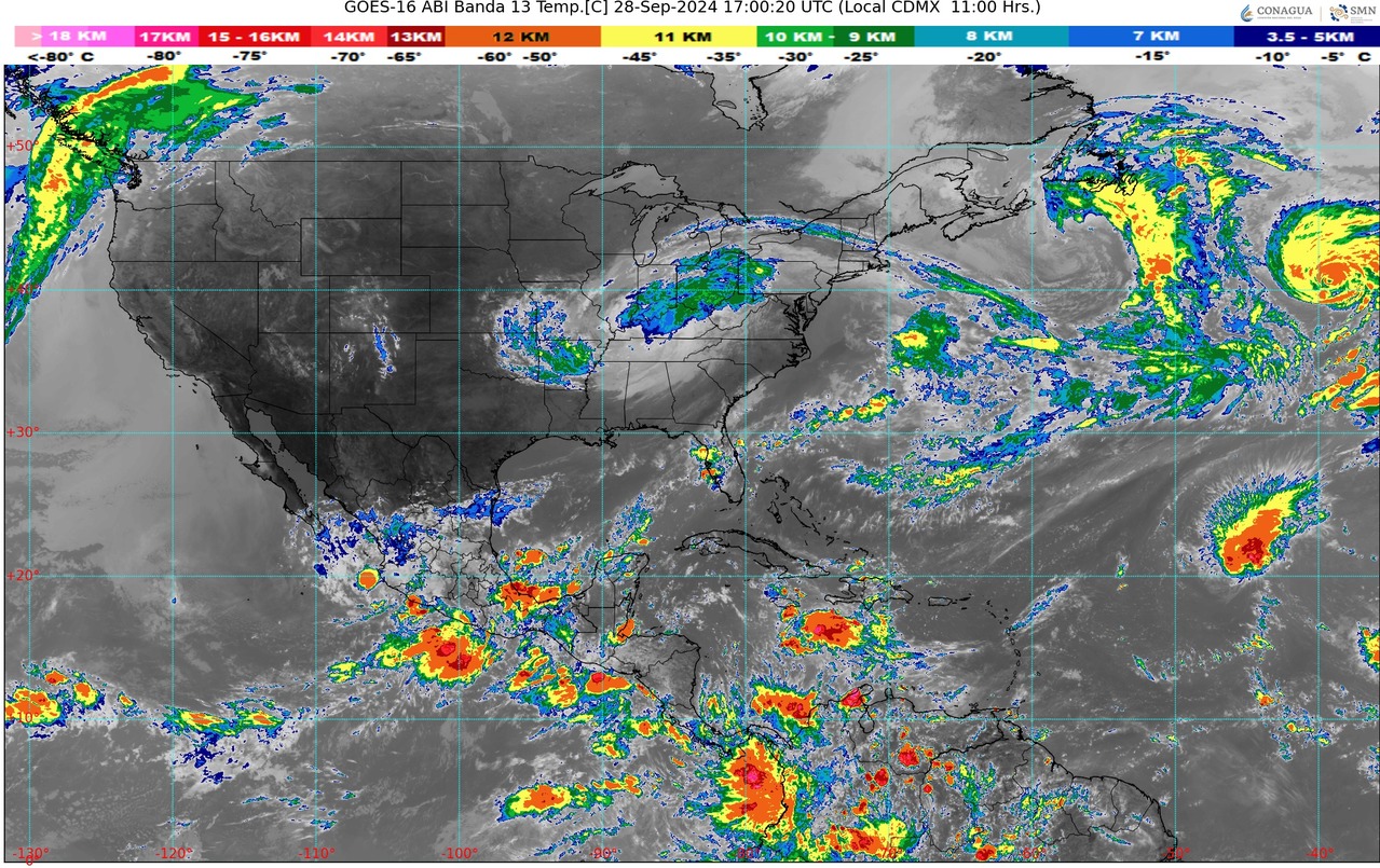 CDMX, 28 de septiembre del 2024.- Este día sábado, la amplia circulación de los remanentes de John en interacción con un canal de baja presión sobre el occidente y centro del territorio nacional, así como con la vaguada monzónica sobre las costas del Pacífico Sur y Central mexicano, producirán lluvias fuertes a muy fuertes en el occidente, centro y sur del país, además de lluvias puntuales intensas en Michoacán, Guerrero y Puebla.