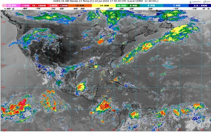 CDMX, 14 de julio del 2024.- Este día domingo, canales de baja presión sobre la sierra Madre Occidental, la Mesa del Norte y el noreste del país, en combinación con inestabilidad en niveles altos de la atmósfera, el ingreso de humedad del océano Pacífico y golfo de México, aunado a la onda tropical No. 9 que se desplazará al sur de las costas de Jalisco, Colima y Michoacán, producirán chubascos y lluvias fuertes acompañadas con descargas eléctricas en el noroeste, norte, noreste, oriente, centro, occidente y sur del territorio mexicano, con lluvias puntuales muy fuertes en Sonora, Chihuahua, Durango, Sinaloa, Nayarit, Jalisco, Colima, Michoacán y Guerrero.