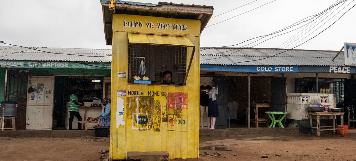 Una mujer mira la lluvia desde un puesto de cambio de dinero en Accra, Ghana.