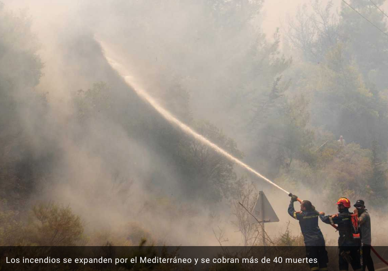27 de julio del 2023.- Los incendios continúan expandiéndose por el Mediterráneo. Italia y Grecia están siendo arrasados por unos fuegos, que también se han declarado en España, Francia y Túnez, mientras que en Argelia el número de fallecidos por los incendios ha aumentado a 40.