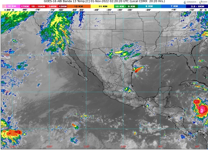 CDMX, 31 de octubre del 2022.- En el transcurso de esta noche-madrugada el sistema frontal Núm. 6 adquirirá características cálidas en el oeste del Golfo de México reforzando la entrada de humedad hacia el noreste del país, así mismo en interacción con un vórtice en niveles altos de la atmósfera y una vaguada polar, mantendrán el potencial de lluvias fuertes, rachas de viento de 50 a 70 km/h y posibles descargas eléctricas en zonas de Chihuahua, Coahuila, Nuevo León y Tamaulipas.