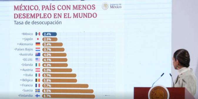 Durante su conferencia en Palacio Nacional difundió una gráfica sobre el desempleo en las principales economías del mundo, donde revela que Japón tiene un nivel de desempleo de 2.5 por ciento, ocupando el segundo lugar.