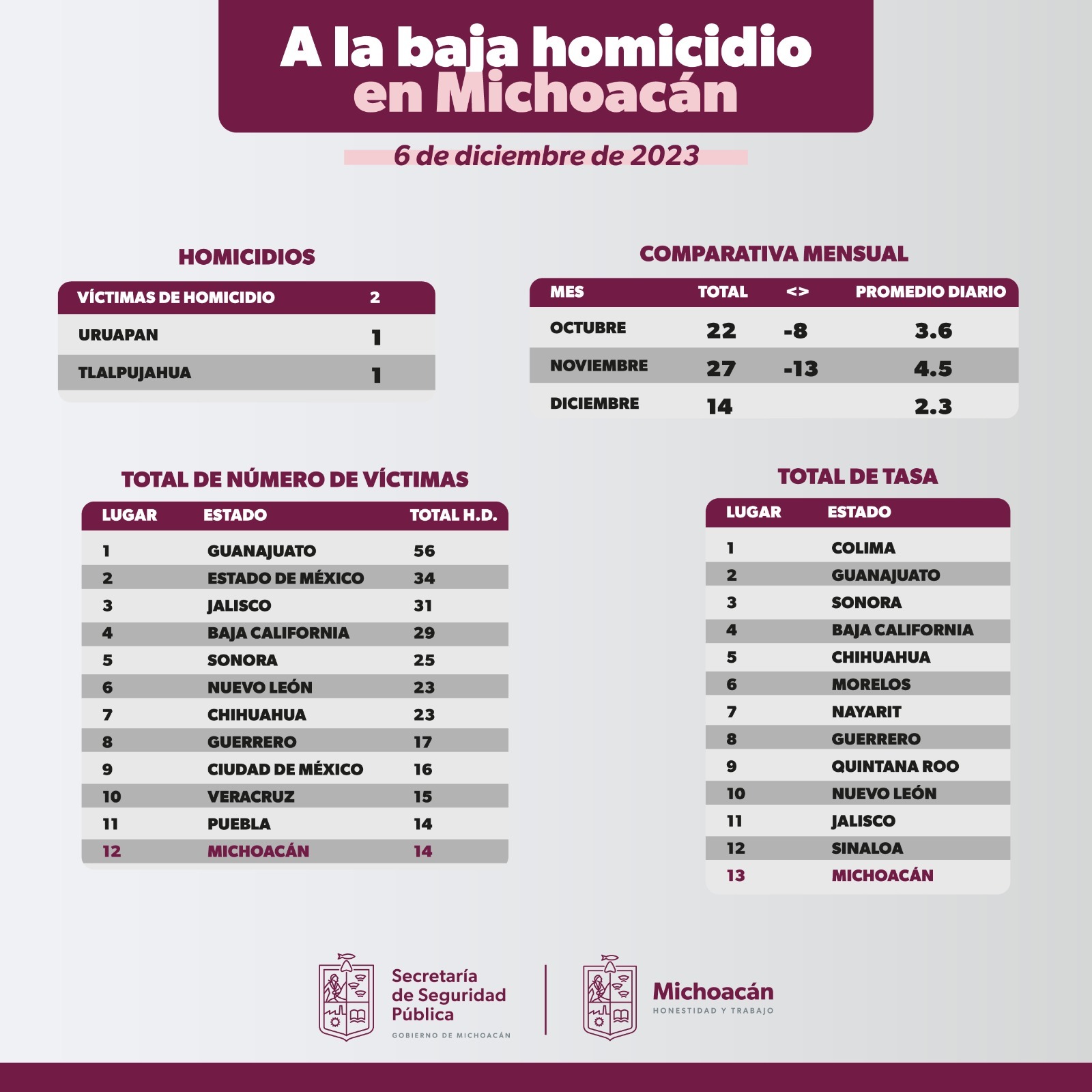 Asimismo, en una comparativa por tasa, es decir, por cada 100 mil habitantes, Michoacán se encuentra posicionado en el lugar número 13, gracias a la suma de esfuerzos y las diversas acciones de operatividad e inteligencia que han permitido la generación de espacios de paz, y la recuperación de la confianza entre las autoridades y la sociedad.
