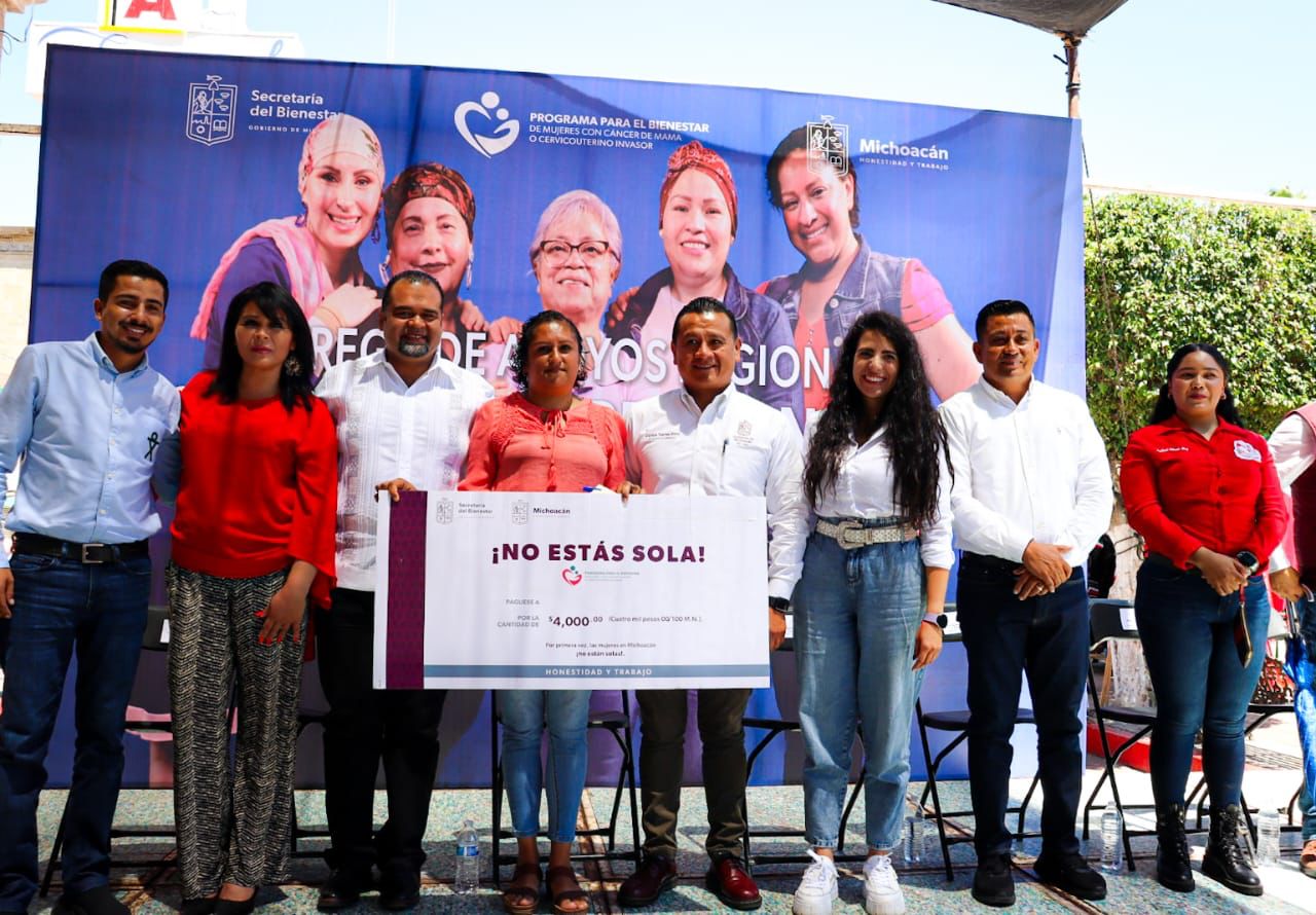 Puruándiro, Michoacán, 14 de septiembre de 2023.- El Gobierno de Michoacán, a través de la Secretaría del Bienestar (Sedebi), hizo entrega de 120 apoyos económicos por un total de 480 mil pesos, en beneficio de 120 beneficiarias del programa Mujeres con Cáncer de Mama y/o Cervicouterino, de este municipio.