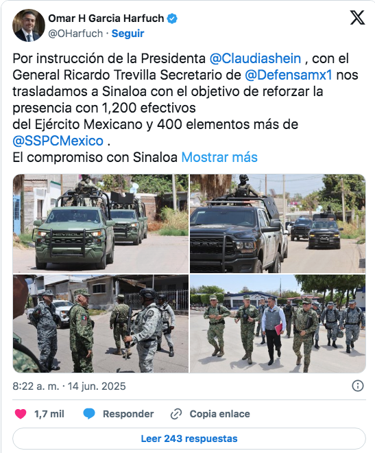 14 de junio del 2025.- El titular de la Secretaría de Seguridad y Protección Ciudadana (SSPC), Omar García Harfuch, informó que se desplegarán mil 200 elementos del Ejército Mexicano y 400 efectivos federales en Sinaloa como parte de un refuerzo de seguridad instruido por la presidenta Claudia Sheinbaum Pardo.