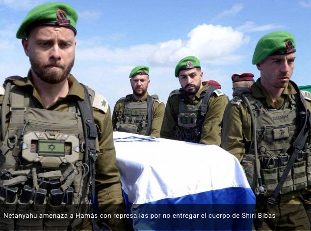 21 de febrero del 2025.- El primer ministro israelí, Benjamín Netanyahu, ha amenazado a Hamás con represalias por no haber entregado el cuerpo de Shiri Bibas, uno de los rehenes cuyos cadáveres fueron devueltos a Israel este pasado jueves como parte del acuerdo de tregua en Gaza. Los análisis forenses confirmaron la identidad de los otros tres cuerpos entregados, pero no el de Shiri. “Actuaremos con determinación”, ha declarado Netanyahu, que ha advertido que Hamás pagará un “precio alto” por lo ocurrido.