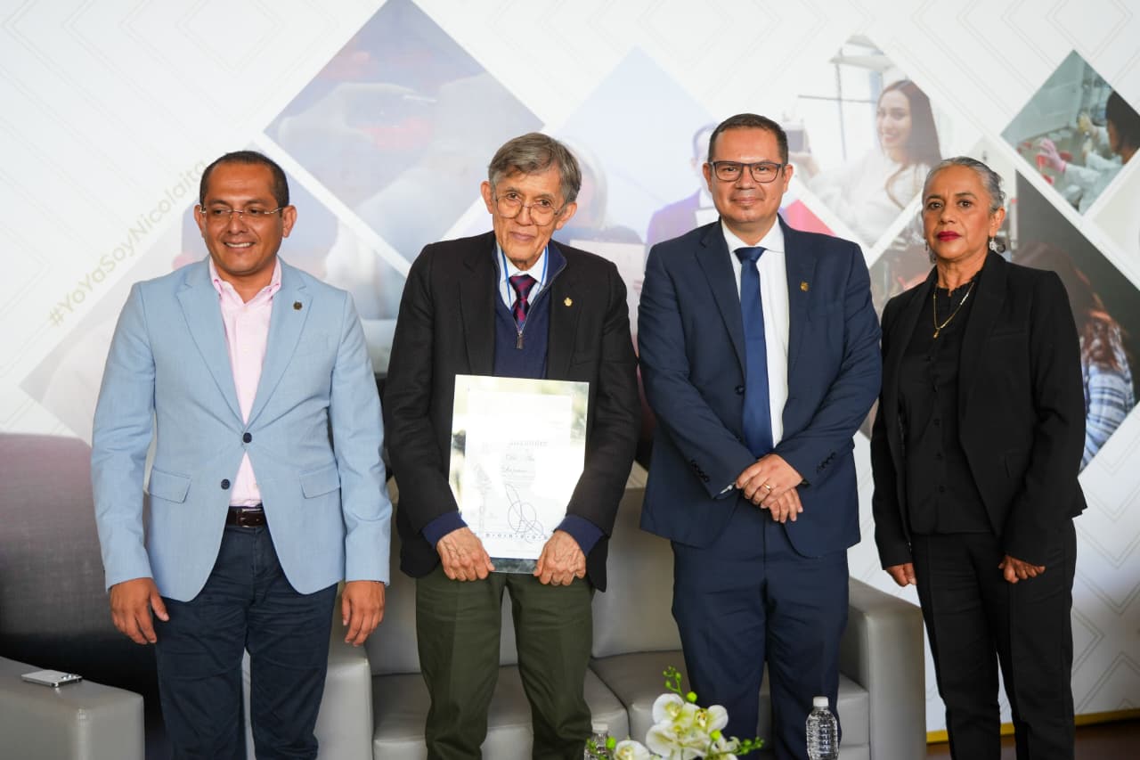 Morelia, Michoacán, a 24 de octubre de 2025.- El destacado científico, Antonio Lazcano Araujo, Doctor Honoris Causa por la Universidad Michoacana de San Nicolás de Hidalgo (UMSNH) visitó la institución para brindar la conferencia magistral “Aspectos recientes sobre el origen de la vida”, que convocó a cientos de estudiantes, docentes, investigadoras e investigadores nicolaitas, quienes mostraron un amplio reconocimiento al biólogo e investigador.