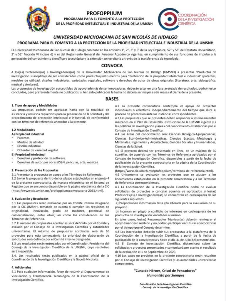 Morelia, Michoacán, 19 de mayo de 2023.- Se encuentra abierta la convocatoria del Programa para el Fomento a la Protección de la Propiedad Intelectual e Industrial de la Universidad Michoacana de San Nicolás de Hidalgo (UMSNH) a través de la Coordinación de la Investigación Científica (CIC), que apoyará diez proyectos en esta edición, y que abarcará Patentes, Modelo de Utilidad, Diseño Industrial, Obtentor de Variedad Vegetal, así como Derechos y Protección de Software y Derechos de Autor de Obras originales.