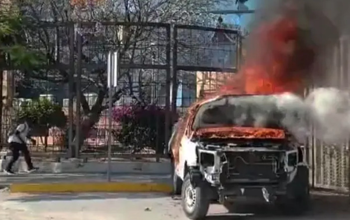 Primeros reportes señalan que al menos 5 vehículos oficiales del gobierno municipal fueron incendiados, además de que las instalaciones fueron vandalizadas por los normalistas.