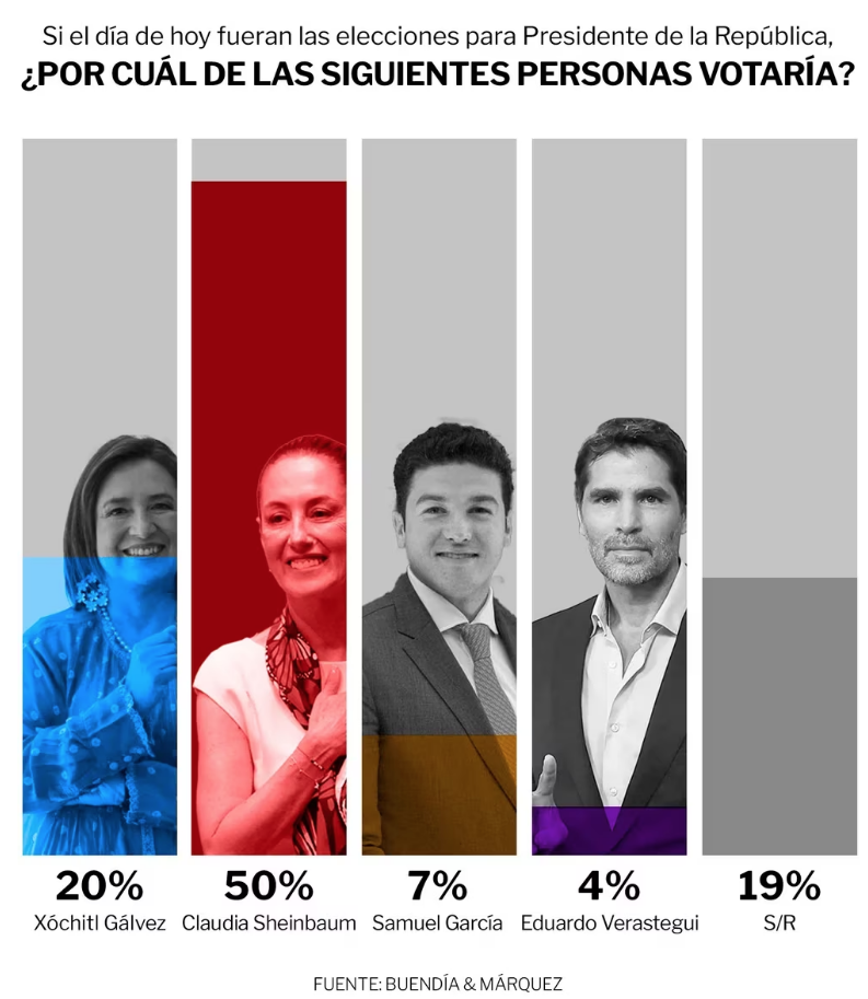 Sin embargo, una de las más recientes encuestas realizadas por la empresa buendía & márquez, reveló que hasta el momento Claudia Sheinbaum, candidata presidencial de Morena, lidera la preferencia electoral con 30 puntos porcentuales por encima de otros aspirantes como Xóchitl Gálvez, del Frente Amplio; Samuel García y Dante Delgado, de Movimiento Ciudadano; y Eduardo Verástegui, quien va por la vía independiente.