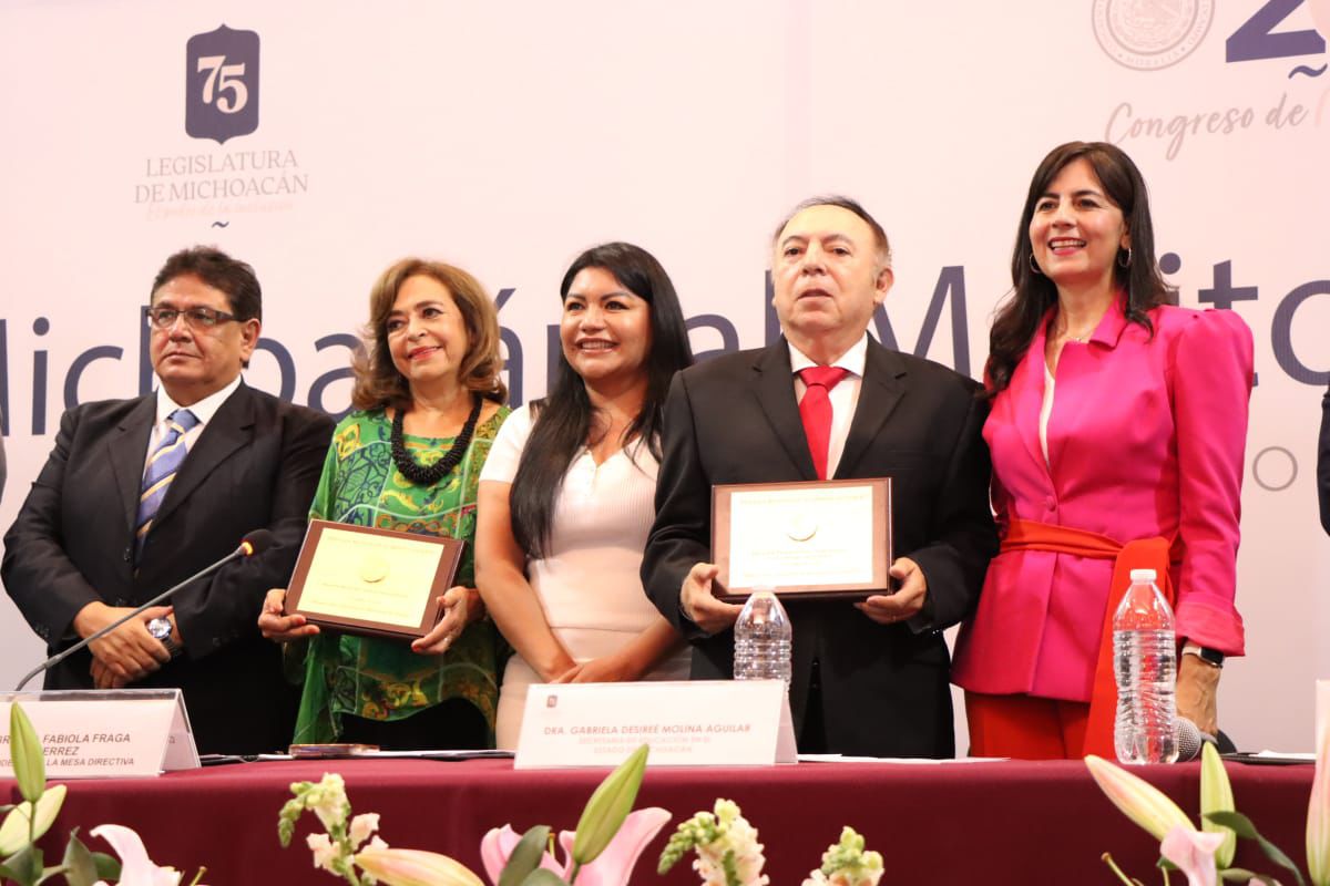 Morelia, Michoacán, a 14 de mayo de 2024.- (101/24). La 75 Legislatura del Estado reconoció hoy el gran valor de las y los maestros de Michoacán con la entrega de la Medalla al Mérito Docente 2024, a María del Carmen Vaca Ramírez, del ámbito de la educación especial, y a la escuela preparatoria Taximaroa, de Ciudad Hidalgo.
