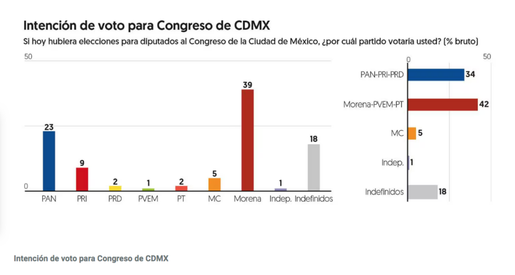 En la intención de voto para el Congreso local, Morena y sus aliados atraen 42 por ciento de apoyo, mientras que la alianza PAN-PRI-PRD suma 34 por ciento, y MC, 5 por ciento. El 1 por ciento se inclina por alguna opción independiente, y 18 por ciento no manifestó preferencia.