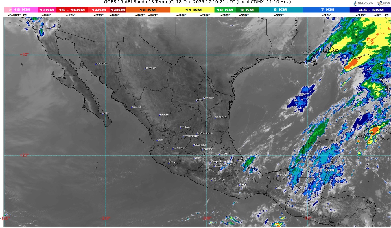 CDMX, 18 de diciembre del 2025.- Este día jueves, una vaguada polar en niveles medios y altos de la atmósfera y canales de baja presión en el interior del territorio nacional, mantendrán la probabilidad de chubascos y lluvias puntuales fuertes con descargas eléctricas y posible caída de granizo en los estados del occidente, centro y sureste del país, incluidos el Valle de México y la península de Yucatán, así como lluvias puntuales muy fuertes en Chiapas.