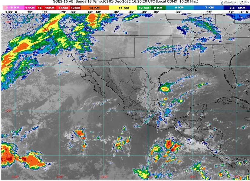 CDMX, 01 de diciembre del 2022.- Para hoy jueves, el sistema frontal Núm. 12 se extenderá como estacionario sobre el oriente y norte del Golfo de México, en interacción con un canal de baja presión extendido sobre el sureste del país, ocasionarán lluvias puntuales muy fuertes en Veracruz, Oaxaca, Chiapas y Tabasco, lluvias fuertes en Tamaulipas, San Luis Potosí y Puebla; todas con descargas eléctricas y que podrían originar incremento en los niveles de ríos y arroyos, deslaves e inundaciones en zonas bajas.