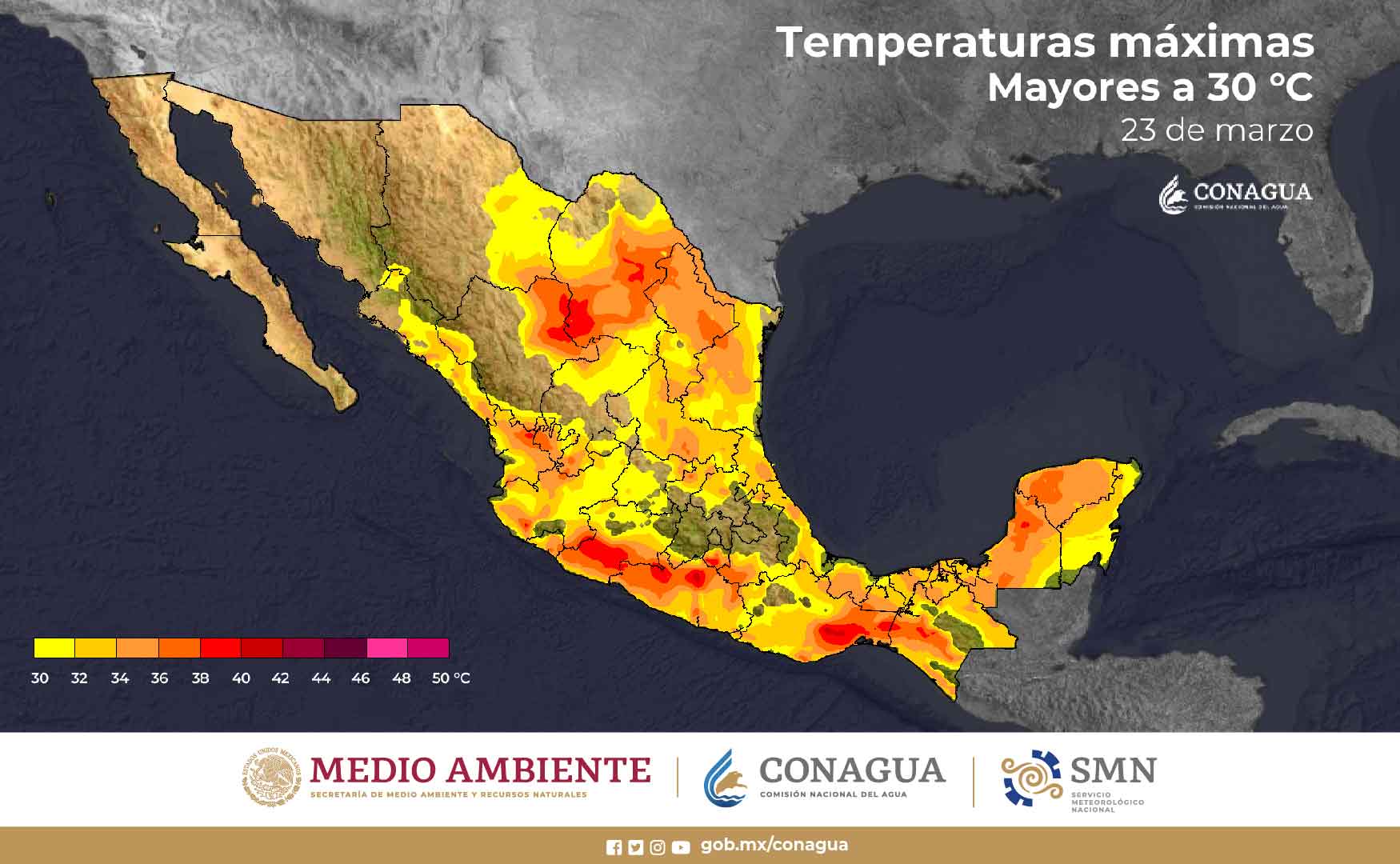 Temperaturas máximas de 35 a 40 °C: Coahuila, Nuevo León, Tamaulipas, San Luis Potosí, Sinaloa, Nayarit, Jalisco, Colima, Puebla (suroeste), Oaxaca, Veracruz, Chiapas, Tabasco, Campeche, Yucatán y Quintana Roo.