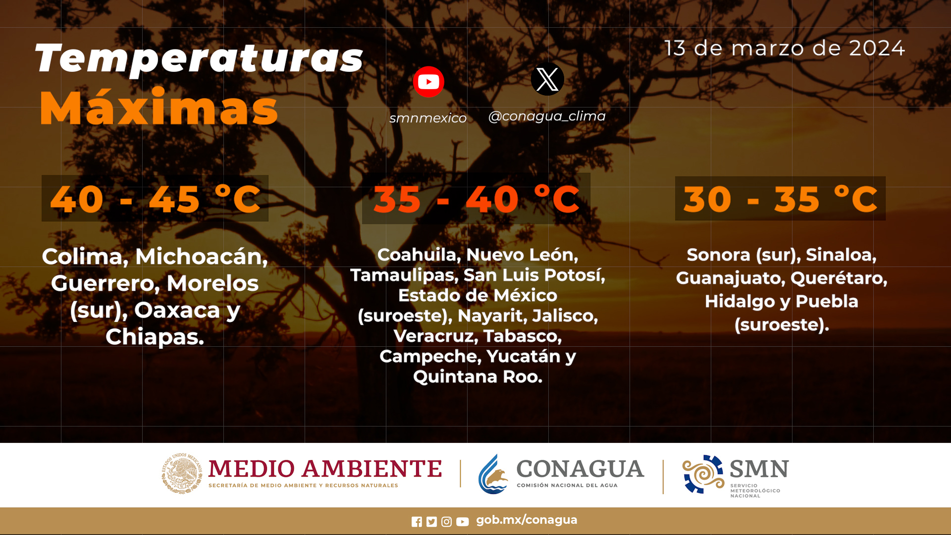 Temperaturas máximas de 35 a 40 °C: Coahuila, Nuevo León, Tamaulipas, San Luis Potosí, Estado de México (suroeste), Nayarit, Jalisco, Veracruz, Tabasco, Campeche, Yucatán y Quintana Roo.